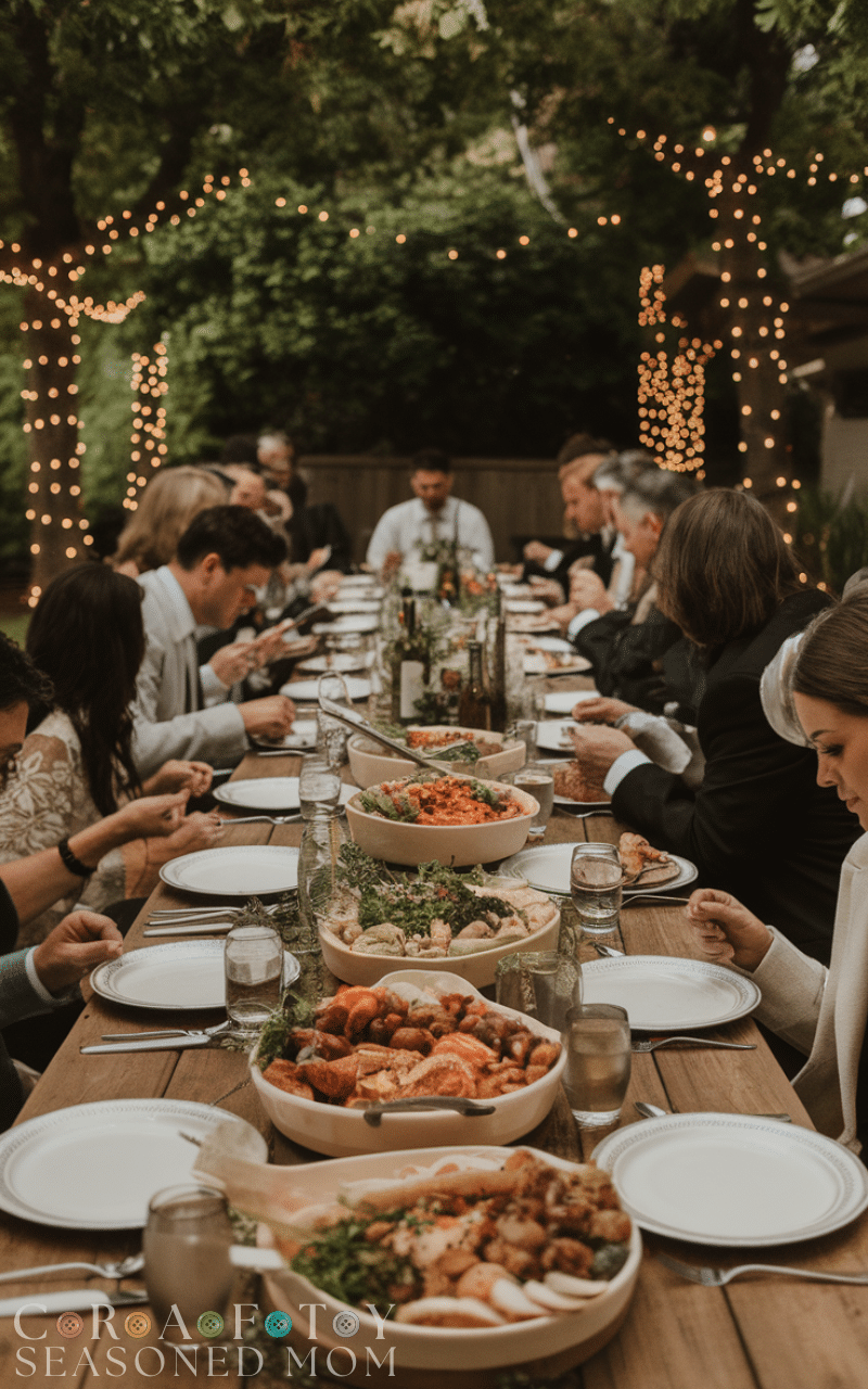 And when the night came we all sat together sharing food and laughter and I served some of my favorite homemade treats like banana bread and mini sandwiches and creamy mashed potatoes with gravy and I also made fruit salad and chocolate cupcakes and a little punch to go with it and someone even brought garlic bread and roasted veggies so there was something for everyone and I swear it all tasted ten times better under those little twinkling lights that made the Small Backyard Wedding feel like a dream.
