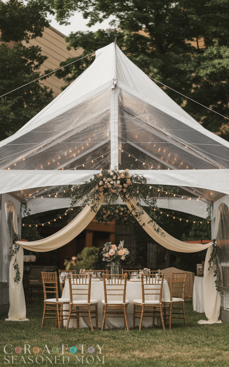 A canopy or clear tent can protect guests from weather while keeping the outdoor feel alive. For a small backyard wedding it’s practical and stylish. You can decorate the tent with lights flowers or draped fabric to make it feel cozy and magical while still enjoying the open-air vibe.