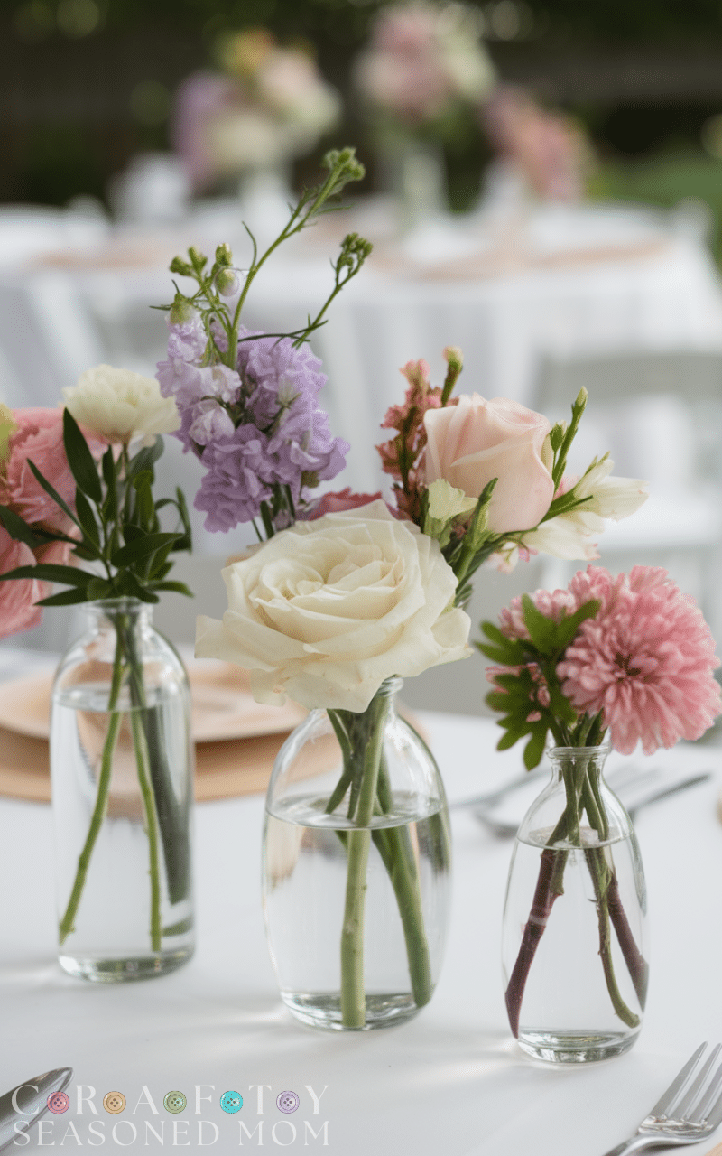 Keep your floral décor simple and elegant with small vases of seasonal flowers. For a small backyard wedding this approach looks fresh and modern while staying budget-friendly. Choose flowers that match your color theme and spread them evenly across tables to create a clean and balanced aesthetic that feels effortlessly beautiful.