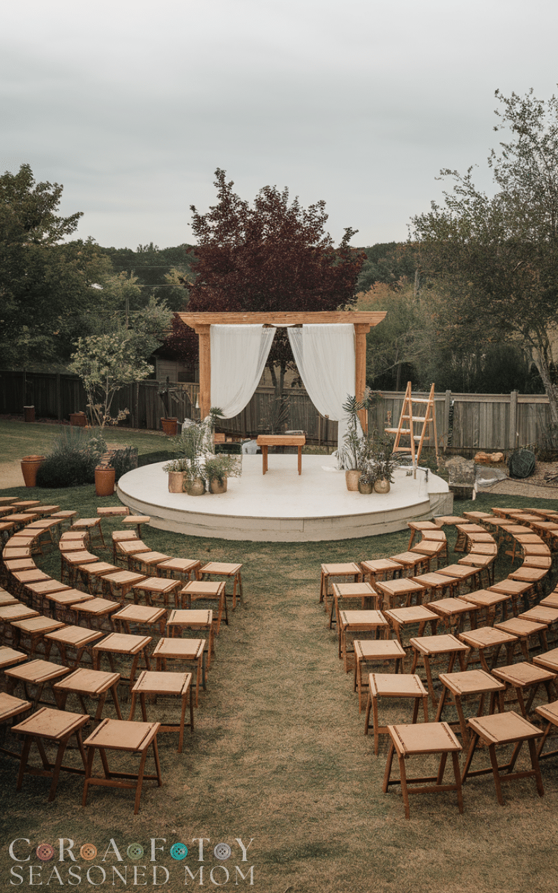 Instead of rows of chairs try setting up circular seating around the altar. This layout is perfect for a small backyard wedding because it brings everyone closer and makes the moment feel more personal. Guests can see you from every angle and you’ll feel surrounded by love and warmth as you exchange your vows.