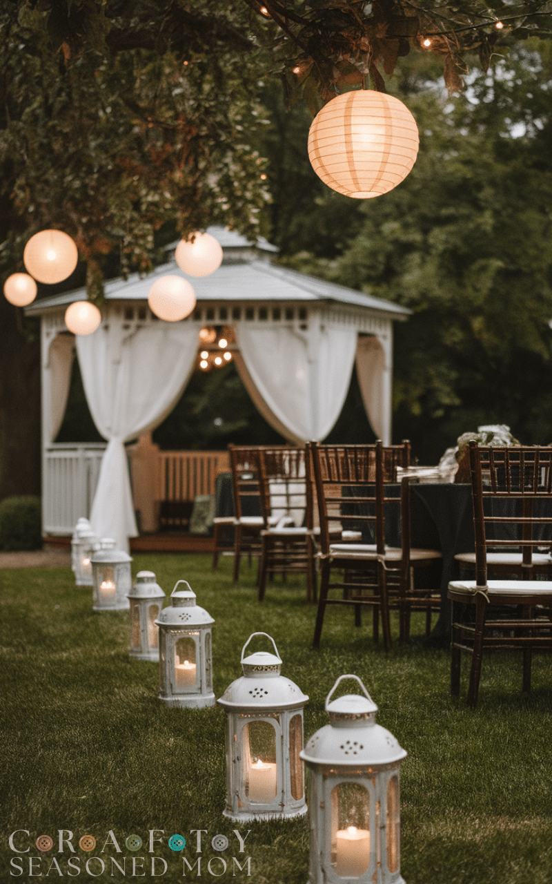 Lanterns placed along walkways or tables add a magical glow to your small backyard wedding. You can use battery candles or solar lights to create a safe soft shimmer. As the evening goes on the warm flickering light makes your garden feel peaceful romantic and full of heartwarming ambiance for every guest to enjoy.