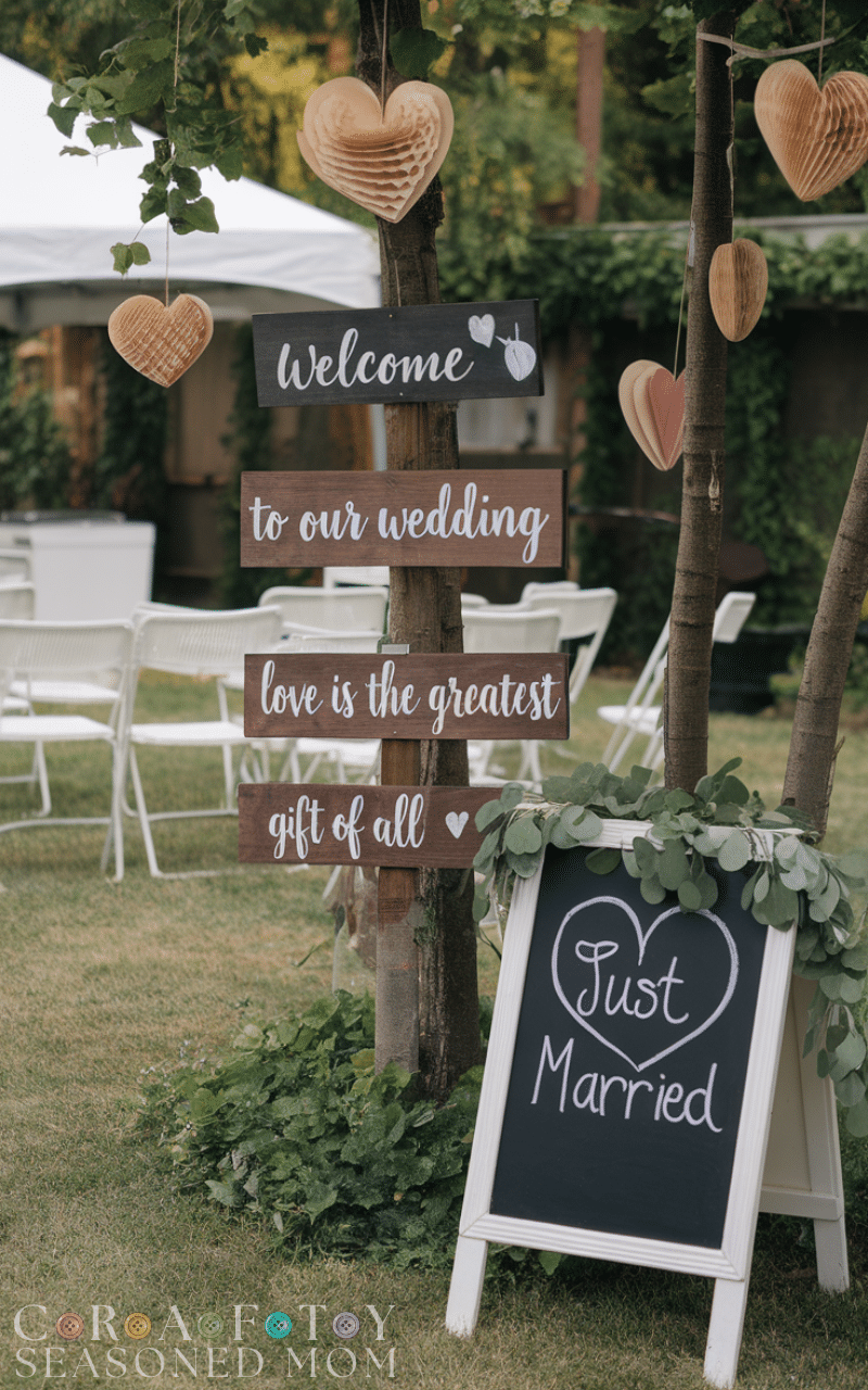 Custom wooden or chalkboard signs are both pretty and practical for a small backyard wedding. You can use them to show directions display your love story or welcome guests in a creative way. Handwritten messages or quotes add a warm and personal touch that turns your space into something truly yours and unforgettable.