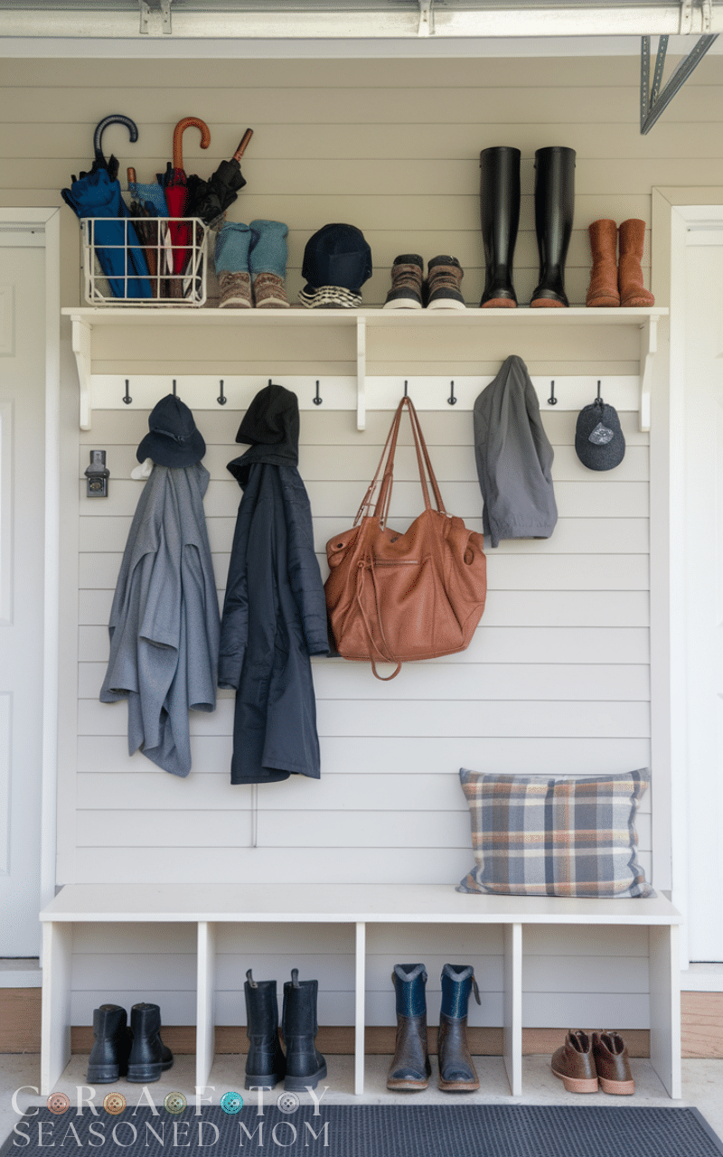 Among the top Garage Mudroom Ideas this one keeps raincoats and umbrellas and winter gear all in one easy spot and this helps you prepare fast for any weather and it avoids searching around the house and it keeps the space tidy and simple and the wall becomes a functional display that saves time every single day and this idea is one of the most convenient Garage Mudroom Ideas because it supports every season with zero stress.