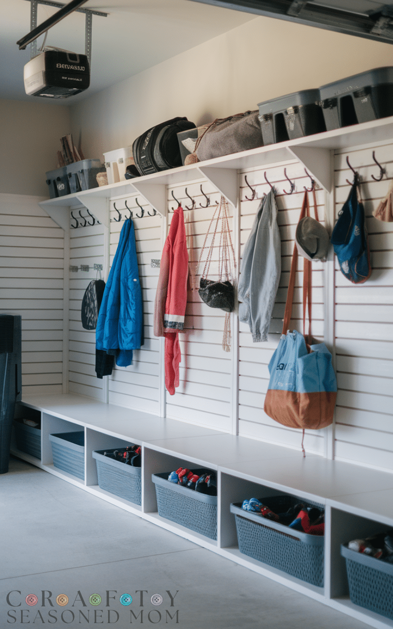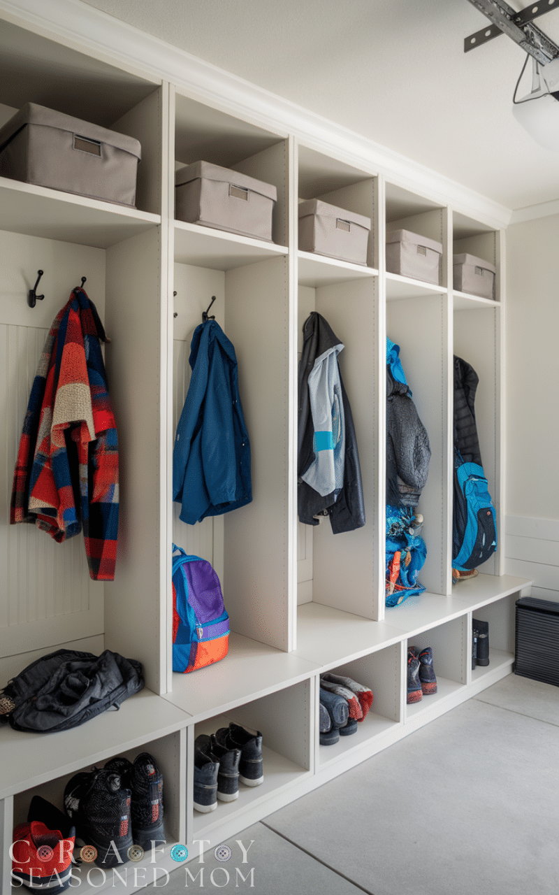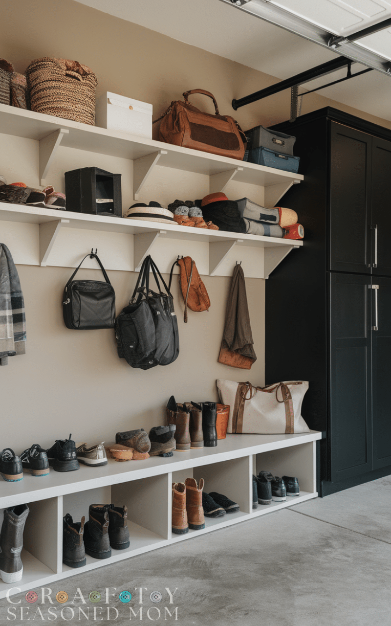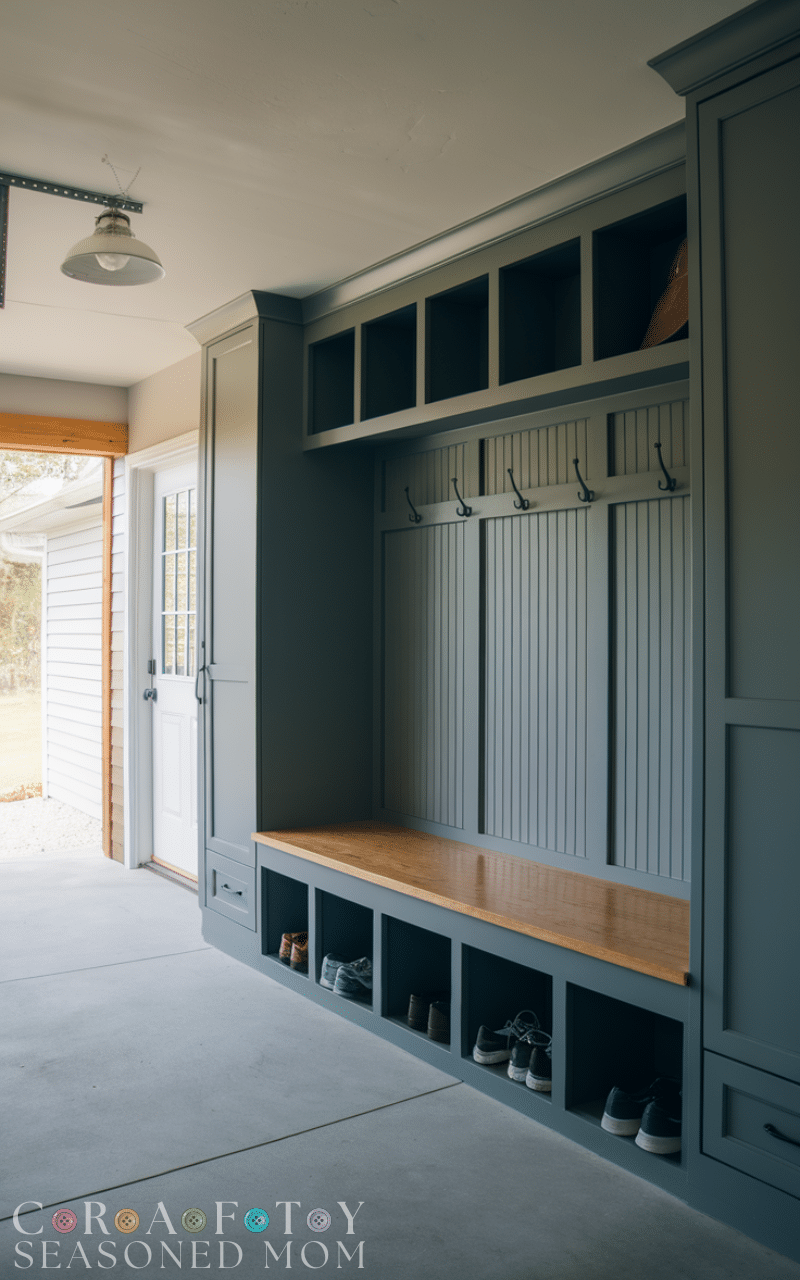 Among all the Garage Mudroom Ideas this one keeps shoes neat and fresh because cubbies with airflow help avoid odors and keep every pair in its own space and this makes it easy to grab the right shoes quickly and it prevents piles near the door that usually cause clutter and this type of storage works perfectly in homes with many shoes and gives you a clean calm feeling every time you enter and this is why ventilated cubbies are one of the smartest Garage Mudroom Ideas you can add.