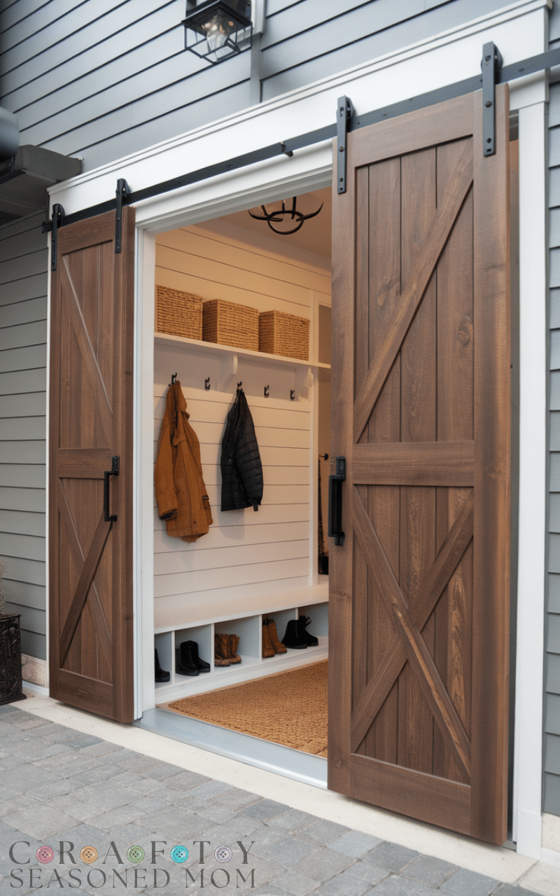 Among the creative Garage Mudroom Ideas sliding barn doors bring style and function at the same time because they let you hide the mudroom area when it is messy while taking zero extra space since they slide instead of opening outward and this gives your garage a warm and charming look and it also helps you control visual clutter and it creates a smooth transition between garage zones and this practical yet beautiful idea fits perfectly with many home styles and it makes sliding barn doors one of the Garage Mudroom Ideas that upgrade the whole entrance.