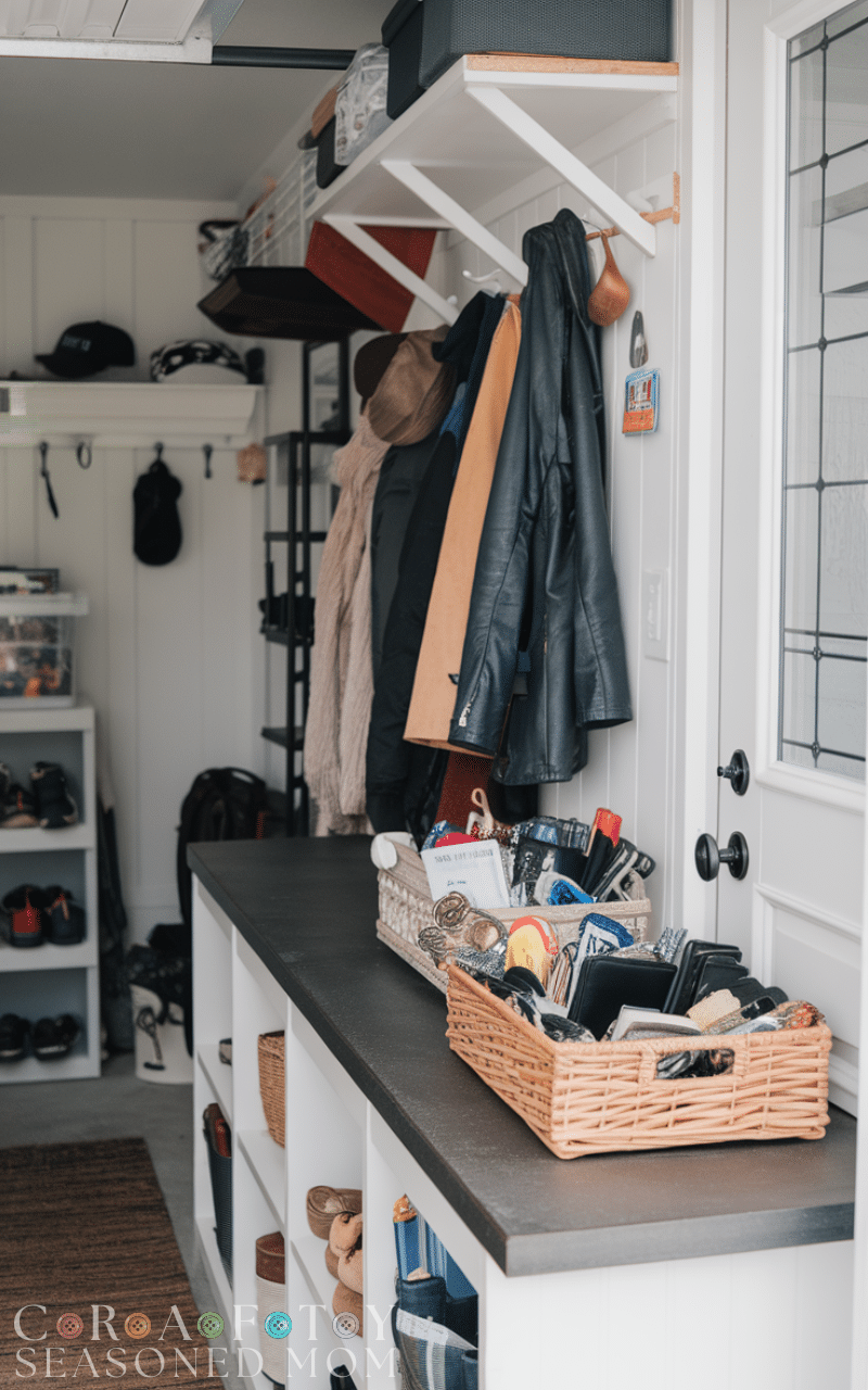 This idea from the Garage Mudroom Ideas list helps avoid the daily chaos that comes from losing small items because a counter near the door lets you place keys and mail and wallets instantly and this creates a steady routine and reduces forgetting things and it keeps your pockets clear and your mind calm and this counter becomes the main landing zone for busy mornings which makes it one of the most useful Garage Mudroom Ideas.
