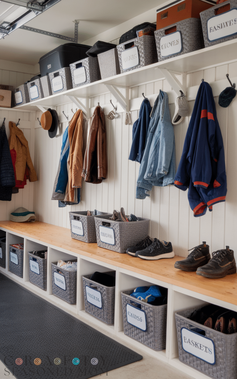 Among the most organized Garage Mudroom Ideas giving each person a labeled basket makes everything smoother because everyone knows exactly where to place their belongings and this reduces stress and arguments and keeps the space from becoming a pile of mixed items and this works well for kids because labels help them build good habits and it brings calm and order to the garage and personal baskets make it one of the neatest Garage Mudroom Ideas you can try.