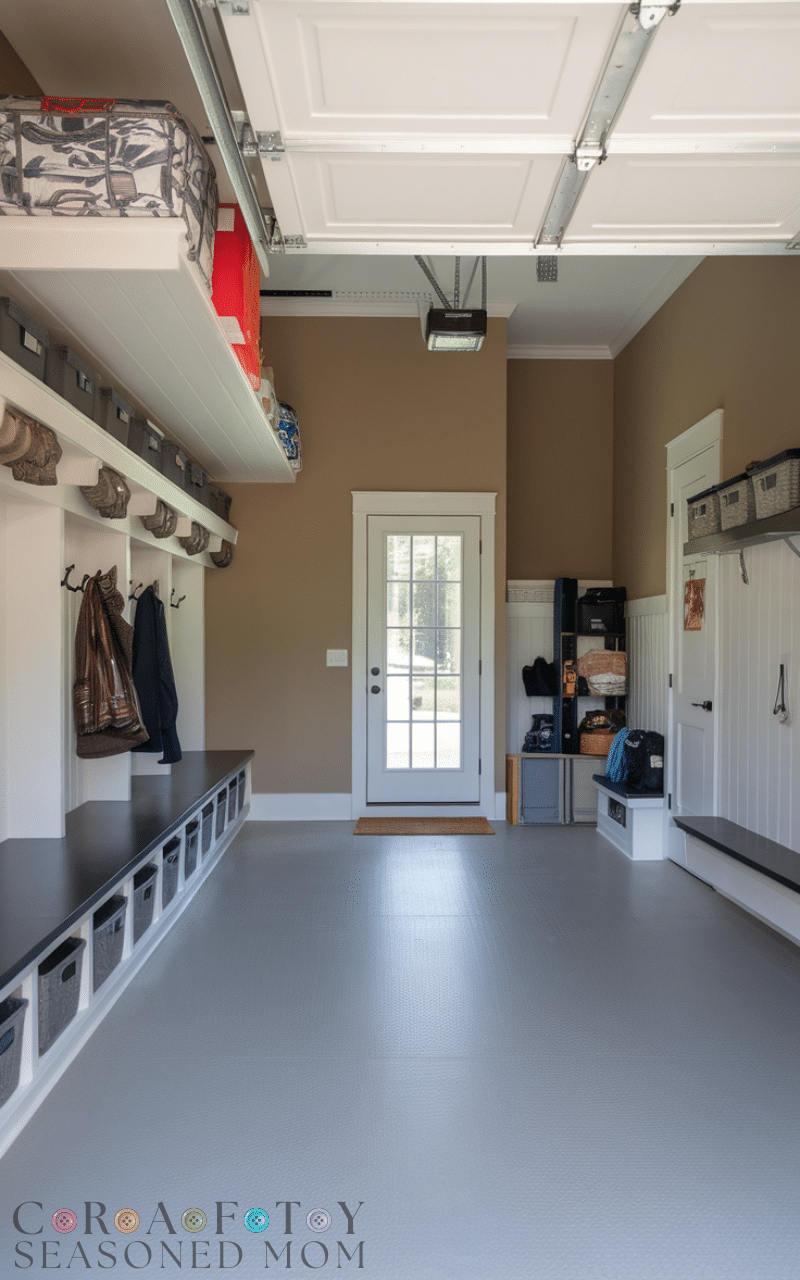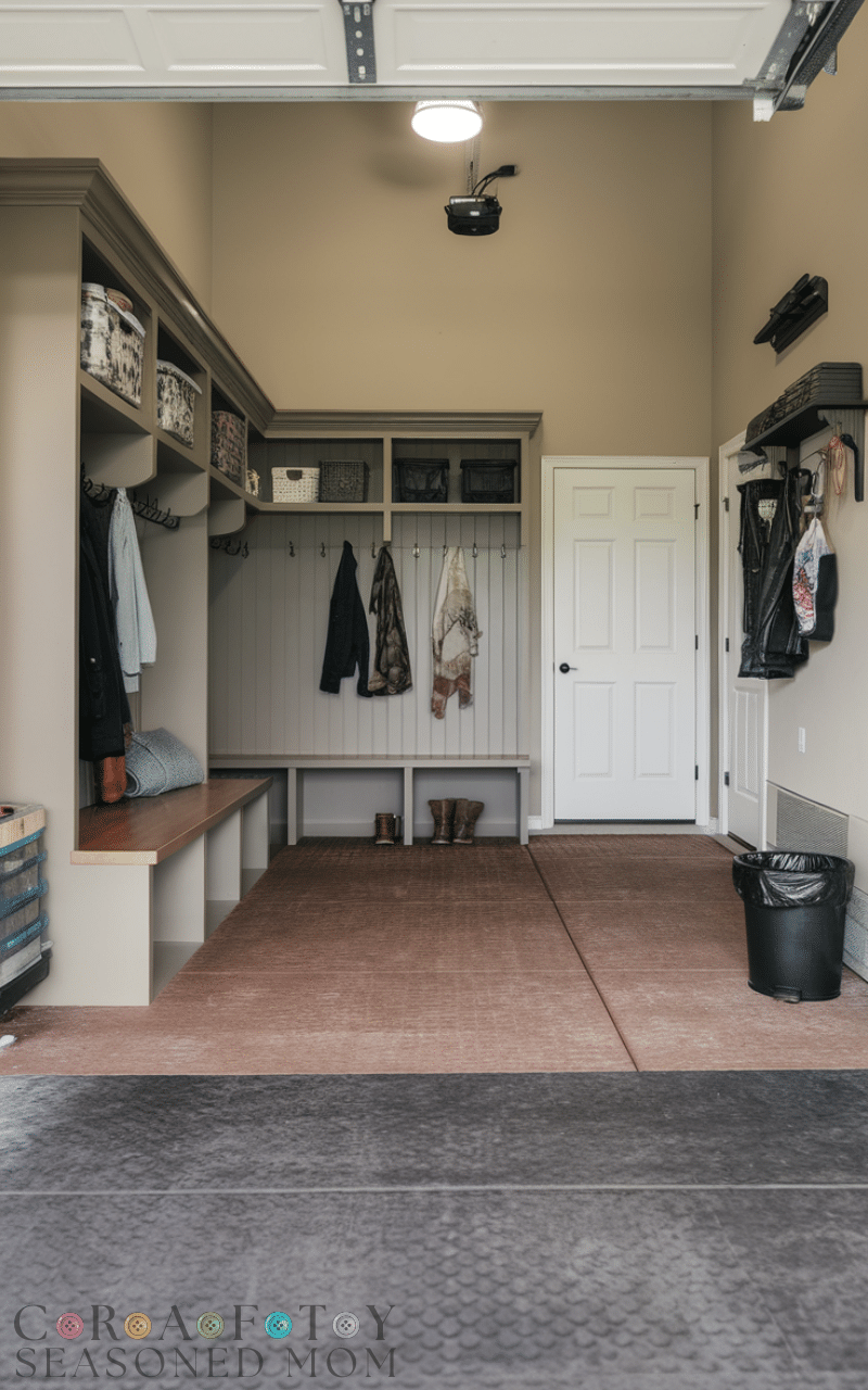 This idea from the Garage Mudroom Ideas list focuses on practicality because durable flooring like rubber or tile helps the area handle mud and water and daily movement and it gives you an easy to clean surface that stays strong for years and it also improves safety since it reduces slipping and it makes the mudroom feel dependable and neat and this simple change transforms the whole space which makes durable flooring one of the Garage Mudroom Ideas that offer long term benefits.