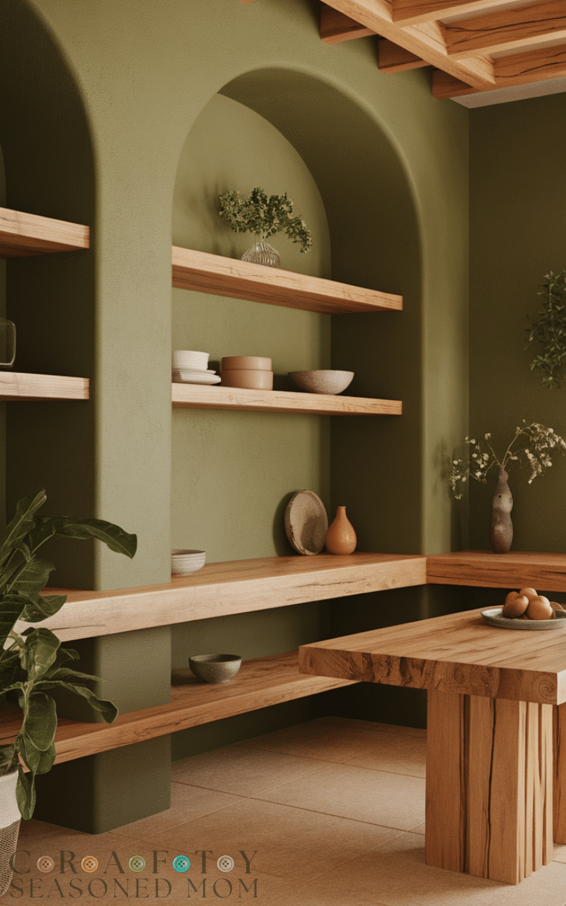 Moss green walls mixed with natural wood shelves is a simple and beautiful idea for Green and Brown Kitchen Designs because you get a cozy and organic feeling and the materials look natural together and this style works great for people who prefer a minimalist but warm approach and the natural wood makes the space feel comforting and the moss green adds depth without becoming too dark and you can add plants and simple décor so the whole kitchen feels connected to nature and full of charm.