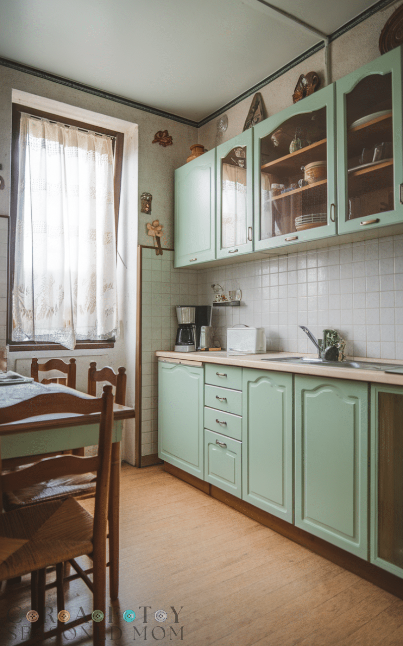 This idea is great for people who want something refreshing and bright because mint green cabinets bring a soft and airy vibe and pairing them with light brown floors keeps the whole design warm and welcoming and this combination is perfect for small kitchens because it makes the space feel bigger and more open and it fits beautifully under the theme of Green and Brown Kitchen Designs and adding white backsplashes and wooden chairs makes the room look balanced and calm and the mint gives life while the soft brown creates stability.