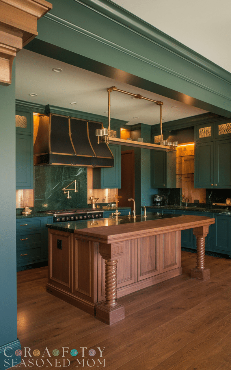 If you want a kitchen that feels rich and luxurious then deep forest green with walnut wood is one of the strongest choices for Green and Brown Kitchen Designs because the dark tones create a bold atmosphere and the walnut brings warmth and texture and this style is perfect for larger kitchens and it becomes even more impressive when you add gold hardware and warm lighting because the shine lifts the deep colors and creates a beautiful contrast and the design looks elegant and timeless and the whole space feels grounded and sophisticated.