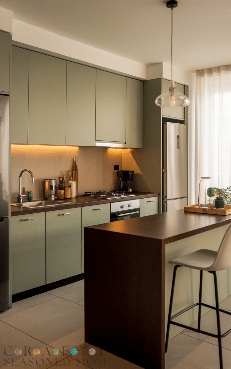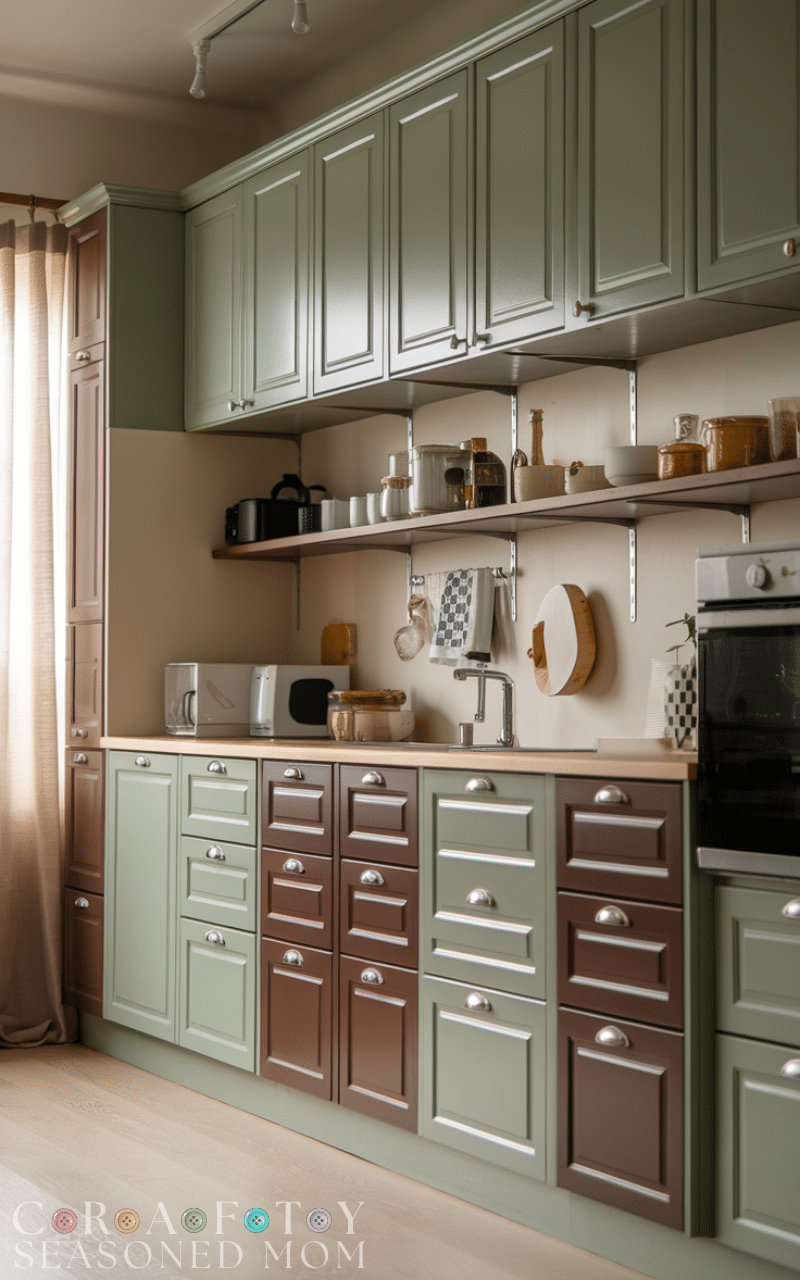 This idea uses sage green cabinets paired with chocolate brown drawers and the combination creates a clean and modern look for Green and Brown Kitchen Designs because the colors balance each other in a stylish way and the vibe stays soft and elegant and this works perfectly for people who love simple lines and tidy spaces and you can add open shelves and soft warm lighting so everything ties together and the design feels refreshing and also professional and the whole mix creates a space that feels organized and soothing and the brown adds depth while the green brings comfort and balance.