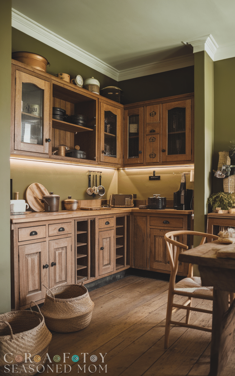 When you combine rustic wood cabinets with olive green walls you create one of the most beautiful Green and Brown Kitchen Designs because the mix brings warm farmhouse energy and fresh earthy tones and this idea works especially well for people who want a cozy and welcoming cooking space and it becomes even better when you add woven baskets and soft lighting so everything feels connected and natural and this style also keeps the kitchen simple and practical and the palette of green and brown makes the room feel calm and grounded and the whole design blends old world warmth with a modern earthy twist so you get a kitchen that feels peaceful and full of charm.