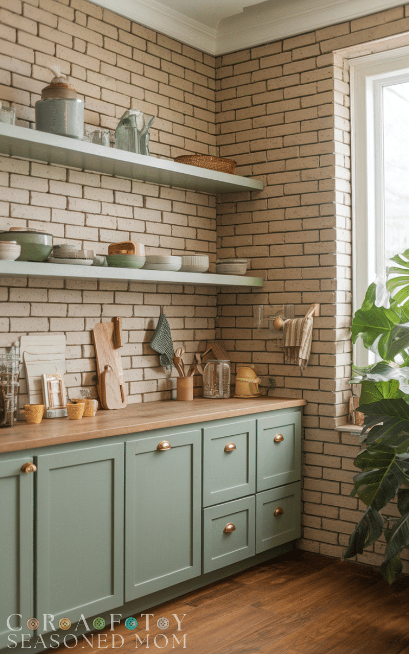 Light brown brick walls bring texture and warmth and when you add sage green shelves you get a refreshing and earthy style that works perfectly inside Green and Brown Kitchen Designs and the brick adds personality while the green adds softness and the combination feels natural and comfortable and this idea is perfect for rustic modern or boho kitchens because it mixes structure with calm colors.