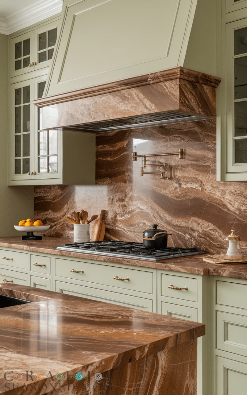 Warm brown marble mixed with pale green cabinets creates a luxurious style that feels soft and welcoming and this combination fits beautifully inside Green and Brown Kitchen Designs because the pale green adds calmness and the marble adds richness and shine and the two colors balance each other in an elegant way and this idea is great for people who want a kitchen that feels refined and peaceful at the same time.
