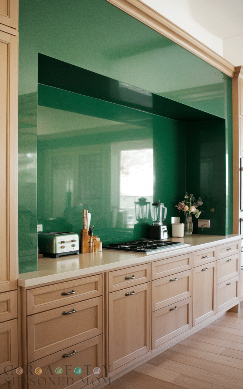An emerald green backsplash can make your kitchen feel vibrant and alive and when you add light brown wood cabinets you get a calming and grounded look and this creates one of the most eye catching Green and Brown Kitchen Designs because the bold green becomes the star while the wood softens the whole style and the combination brings energy and harmony at the same time and it is perfect for people who want a lively but natural kitchen.