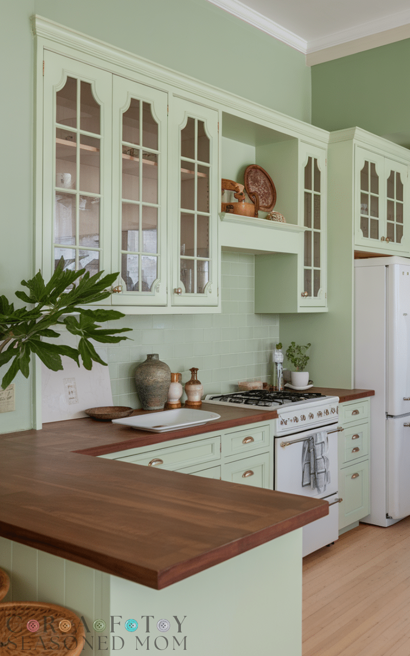 Pastel green walls are soft and calming and when you pair them with walnut countertops you get a clean and elegant look for Green and Brown Kitchen Designs because the tones work together in a gentle and balanced way and this idea fits perfectly in modern homes and the walnut adds richness and character and the pastel walls bring freshness and brightness and everything comes together in a friendly and peaceful atmosphere.