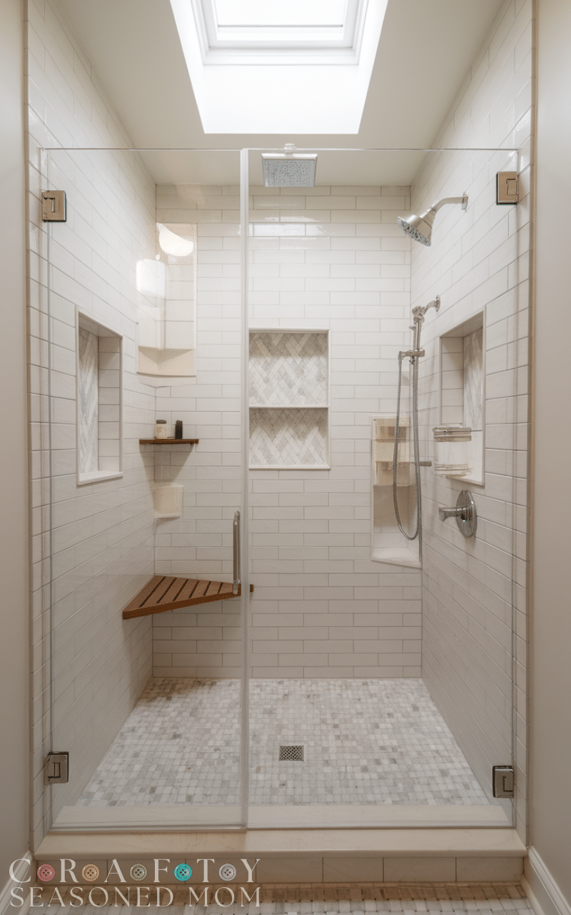 Walk-In Showers Ideas become more comfortable and luxurious when you add a built-in bench. A bench is perfect for relaxing, shaving, or sitting while showering. These walk in showers ideas are especially practical for families and aging-in-place designs. Tiled benches blend seamlessly with the shower design while adding functionality without taking up extra space. It’s a simple upgrade that adds spa-like comfort to everyday routines.