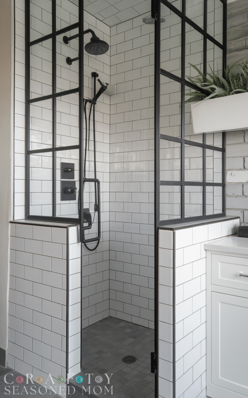 Walk-in shower ideas gain a bold, modern edge with matte black fixtures. Black shower heads, frames, and handles create contrast and add character to simple tile designs. These Walk-In Showers Ideas work beautifully in both modern and industrial bathrooms. When paired with white or light tiles, black fixtures become a strong focal point without overwhelming the space.