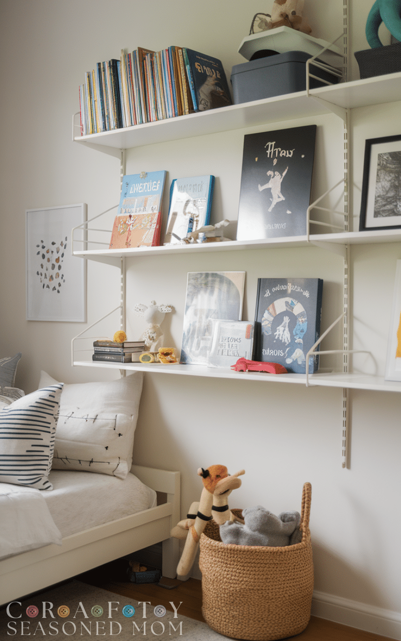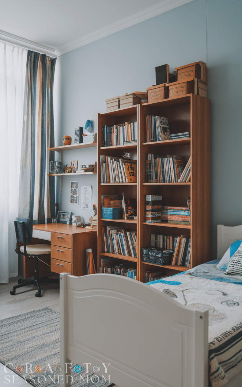 Open shelving supports organized young boys bedroom ideas by keeping favorite books and toys visible. Low shelves encourage independence and make it easy for kids to choose and put away items themselves. This adds both function and style to the room.