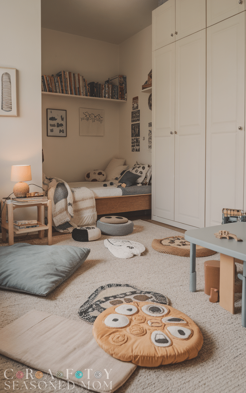 A defined play area is one of the smartest young boys bedroom ideas for keeping activities organized. A soft rug, floor cushions, or a small table can create a dedicated space for playing, building, or reading. This helps separate sleep and play while keeping the room fun.
