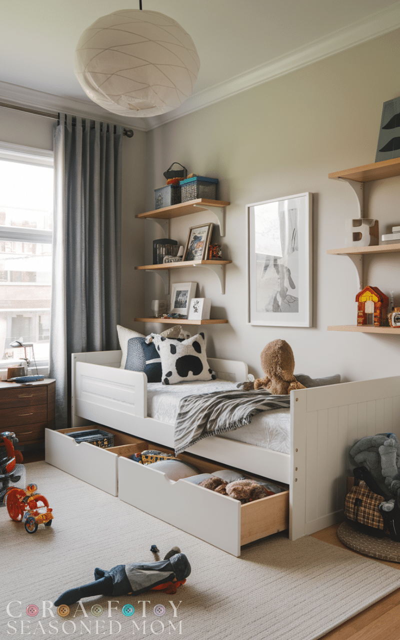 Beds with built-in storage are practical young boys bedroom ideas that maximize space. Drawers under the bed are perfect for toys, clothes, or bedding. This reduces the need for extra furniture and keeps the room open and clutter-free.