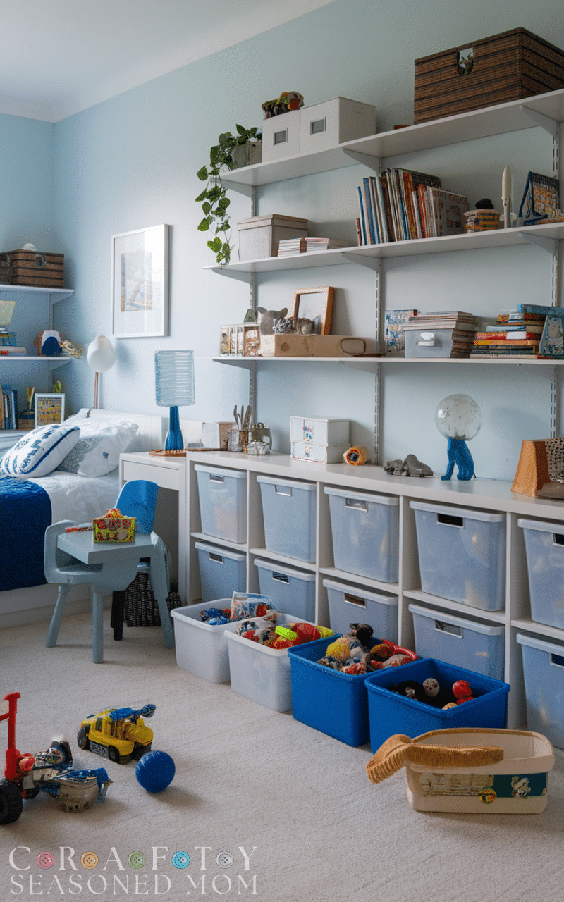 Good storage is essential in young boys bedroom ideas to keep toys organized and floors clear. Use bins, baskets, or low shelves that are easy for kids to access. Keeping toys contained makes cleanup quicker and helps the room stay neat and functional every day.