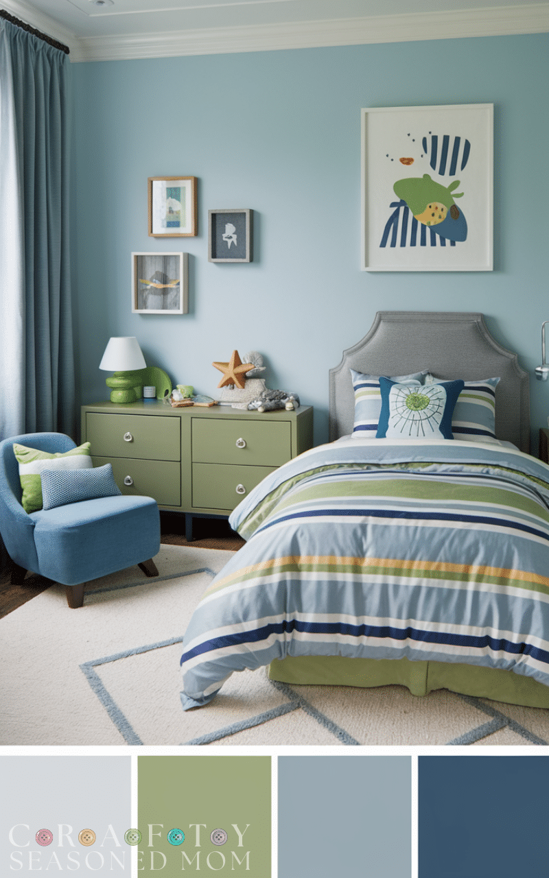 A playful color palette is one of the most effective young boys bedroom ideas because it sets the mood without overwhelming the space. Soft blues, greens, grays, or warm neutrals paired with one fun accent color keep the room cheerful and balanced. This approach allows the bedroom to grow with your child while staying easy to update as interests change.
