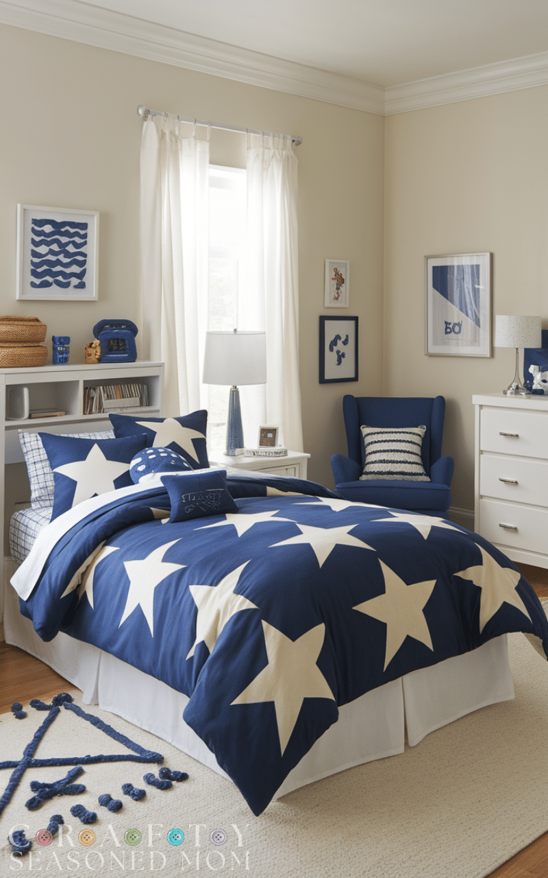 Light themes are popular young boys bedroom ideas that keep the room fun without feeling cluttered. Whether it’s cars, dinosaurs, space, or sports, use themed bedding, wall art, or pillows instead of covering every surface. This keeps the room playful but still calm and easy to rest in.